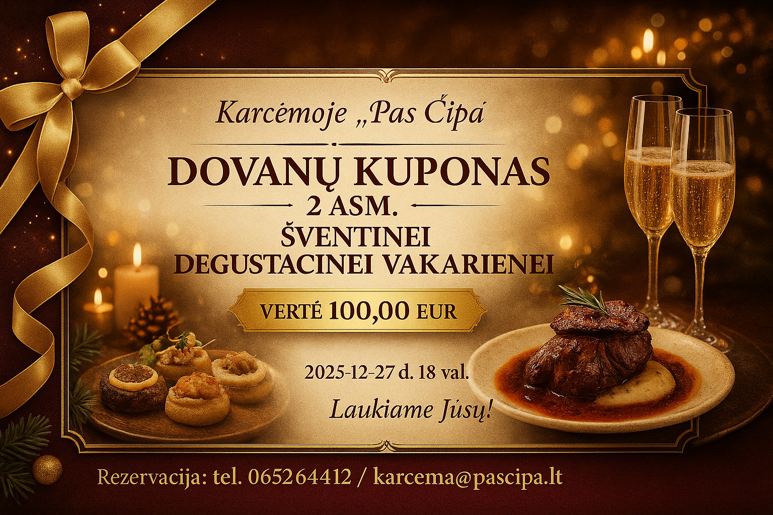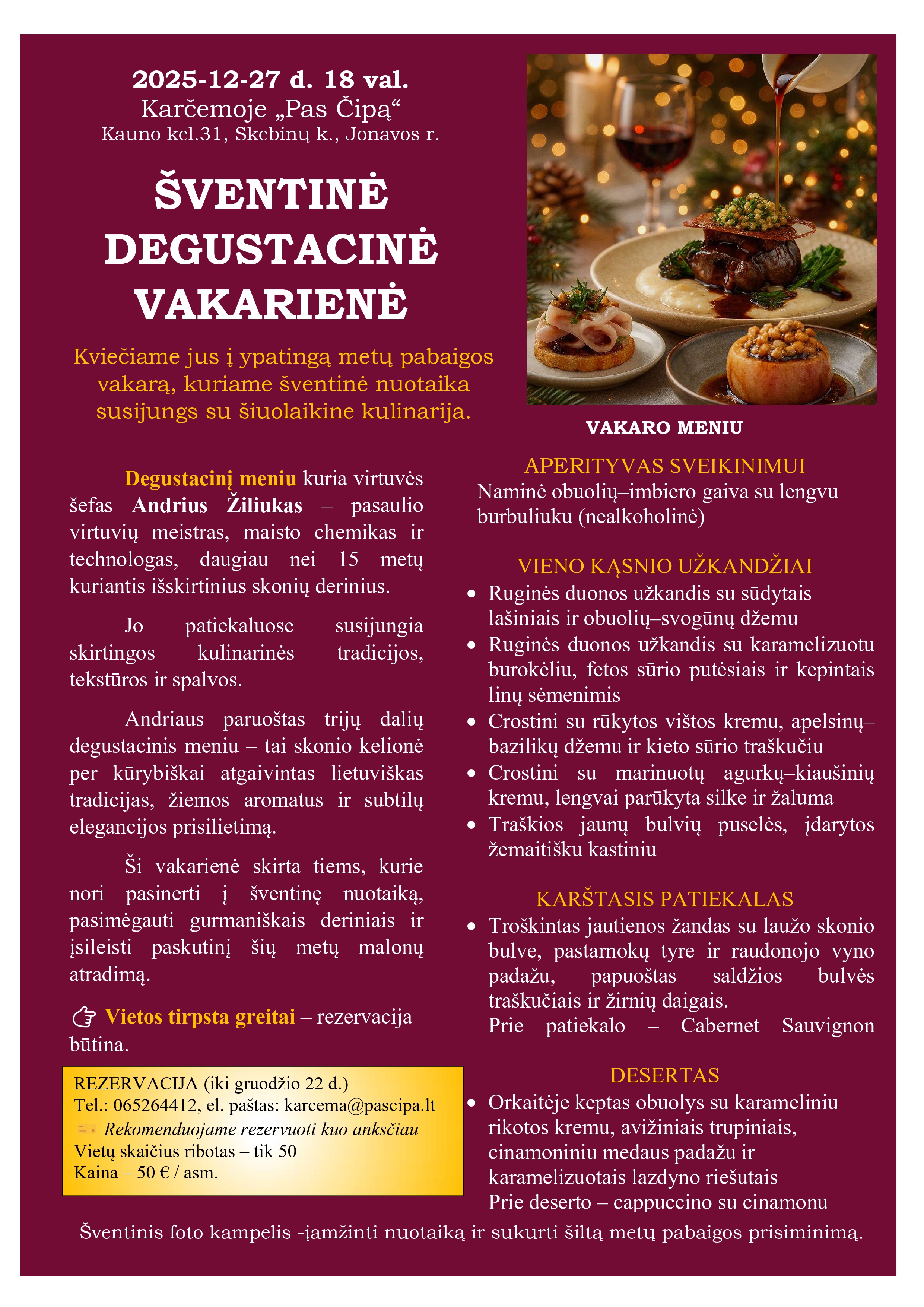 Rezervacija telefonu 065264412 arba el.paštu karcema@pascipa.lt. Rezervacija vyksta iki 25-12-25 d.