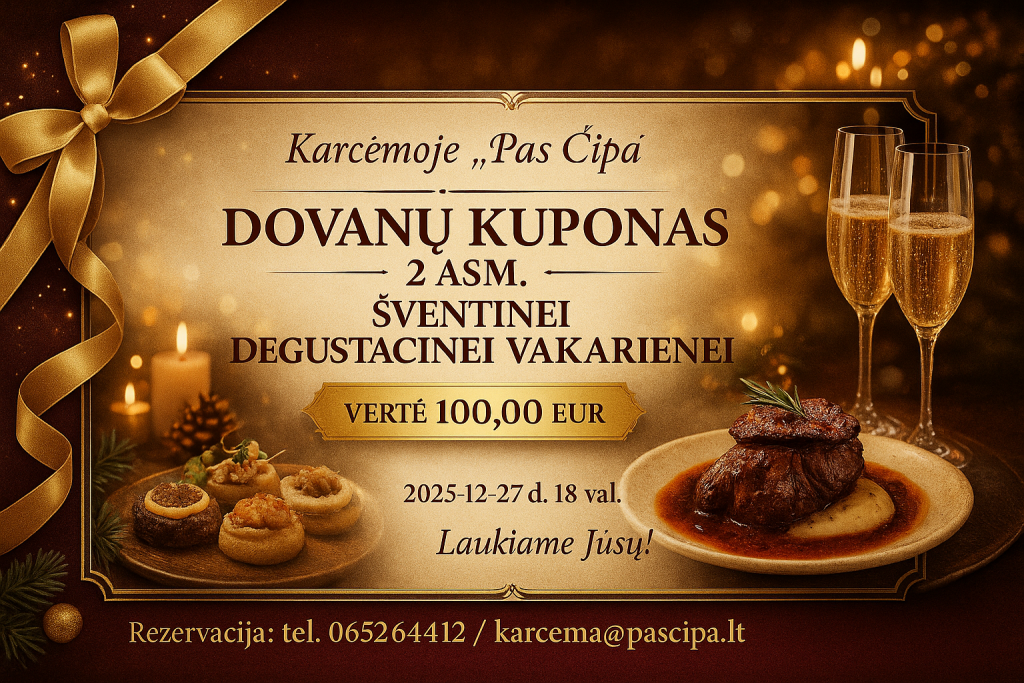 Dovanokite šventinę degustacinę vakarienę dviems Karčemoje „Pas Čipą“ – kulinarinę kelionę, pripildytą išskirtinių skonių, žiemos aromatų ir gurmaniškos atmosferos.