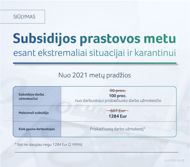 Darbdaviams bus kompensuojamas visas (100 proc.) prastovų metu darbuotojui priskaičiuotas ir išmokamas darbo užmokestis. Subsidijos darbo užmokesčiui maksimalus dydis iki 2 minimaliosios mėnesinės algos dydžių (MMA), t. y. iki 1284 eurų nuo kitų metų.