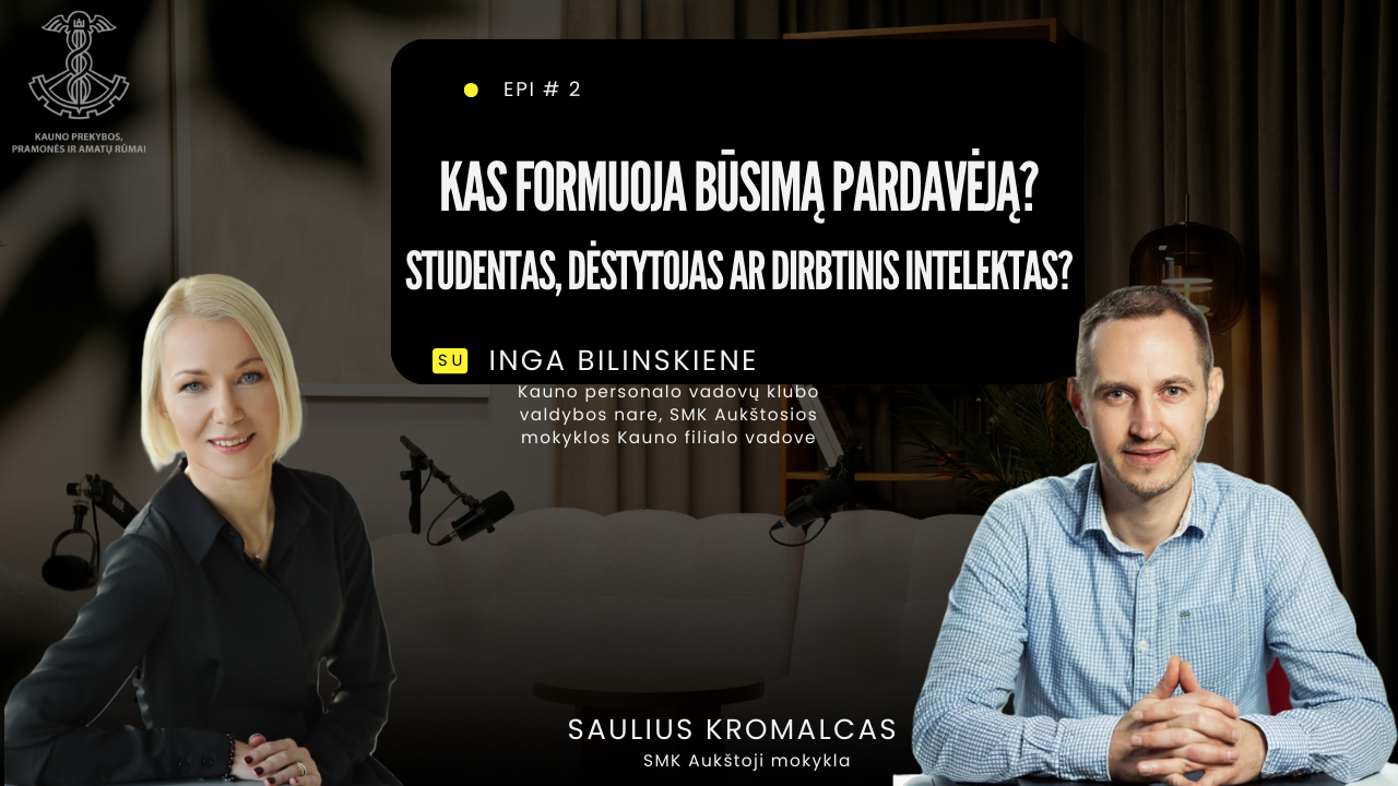 Norėdami šias temas priartinti prie mūsų bendruomenės, parengėme trijų tinklalaidžių ciklą, kuriame kalbamės su profesinių mokyklų, aukštojo mokslo ir verslo atstovais. Jie dalijasi labai skirtingomis, bet viena kitą papildančiomis įžvalgomis apie tai, kokių pardavimų kompetencijų reikia šiandien, kokias mato spragas ir kokį vaidmenį šioje transformacijoje atlieka DI.