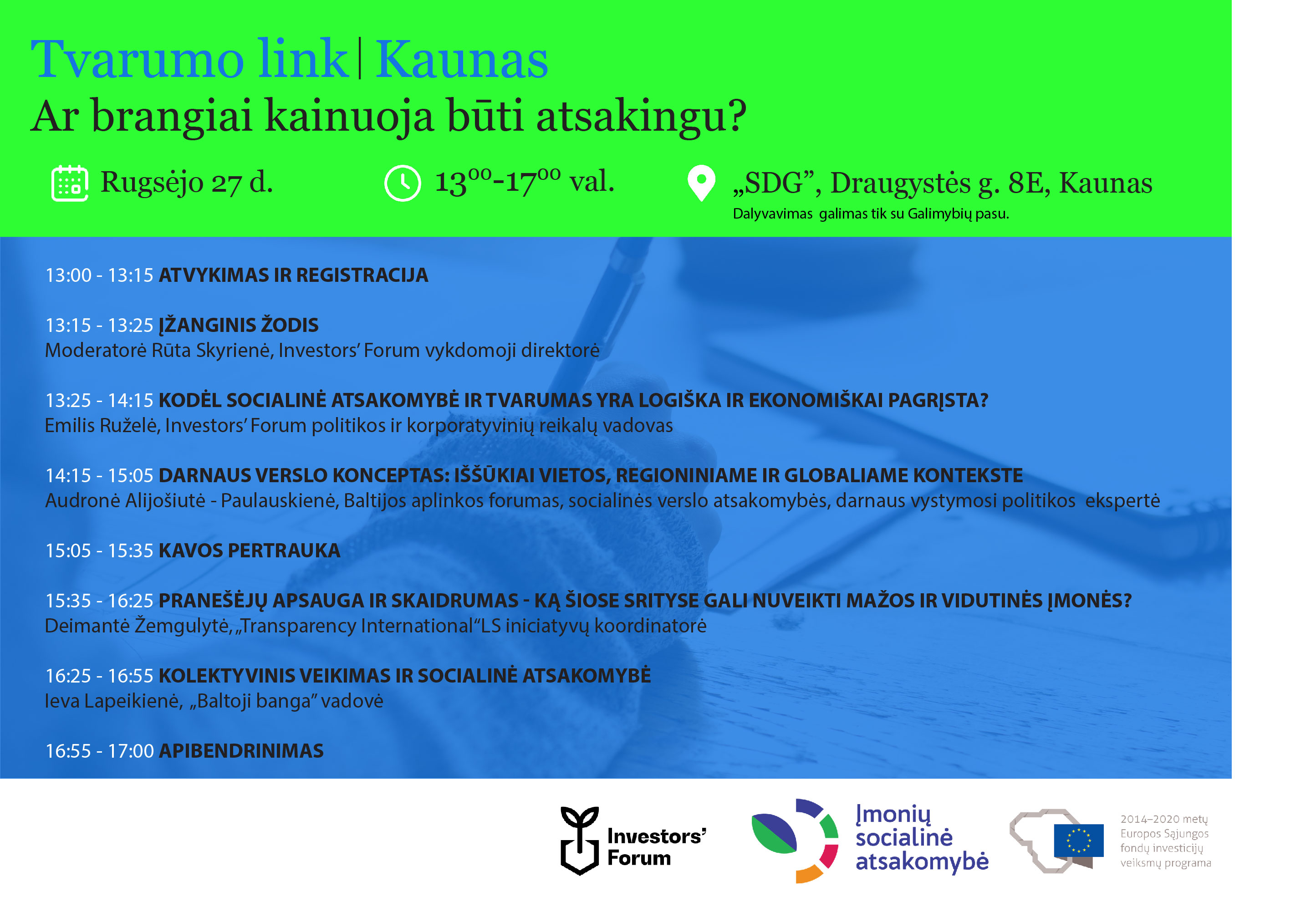 Investors‘ Forum kartu su partneriais organizuoja nemokamą seminarą Kauno verslo bendruomenei. Šis renginys skirtas aptarti įmonių socialinės atsakomybės principus ir tai, ką šioje srityje gali pasiekti mažos ir vidutinės įmonės, bei kokią naudą tai gali atnešti pačioms įmonėms ir visuomenei. Seminare pranešimus skaitys ir savo įžvalgomis bei žiniomis dalinsis ĮSA ekspertai iš Investuotojų Forumo, Transparency International Lietuva bei Baltijos Aplinkos Forumo.