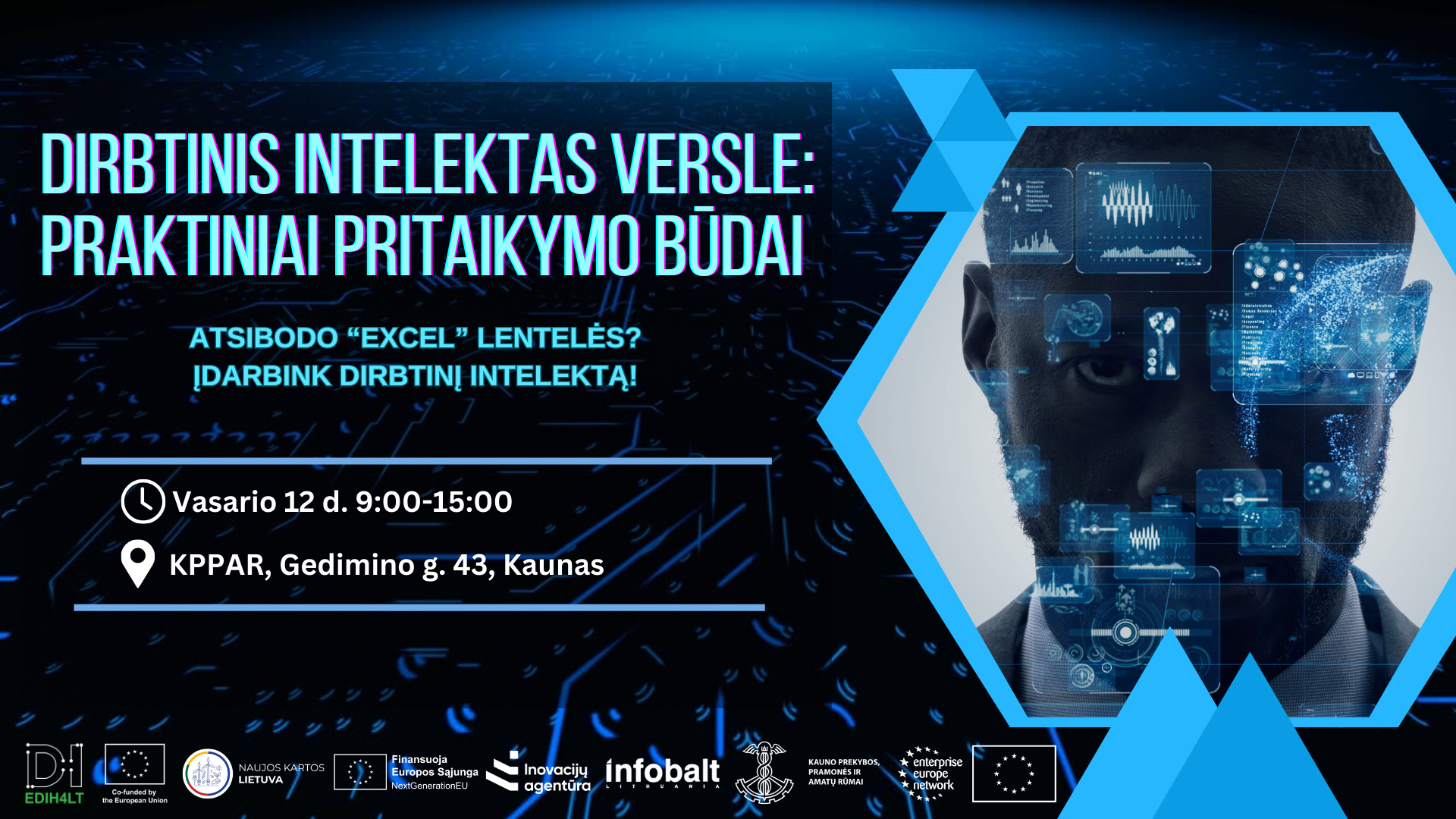 Lietuvos skaitmeninių technologijų asociacija INFOBALT kartu su Kauno prekybos, pramonės ir amatų rūmais ir juose veikiančiu Enterprise Europe Network kviečia dalyvauti mokymuose „Dirbtinis intelektas versle: praktiniai pritaikymo būdai“, skirtuose mažoms ir vidutinėms vidurio ir vakarų Lietuvos įmonėms. Mokymai vyks vasario 12 d. 9 val. Kauno prekybos, pramonės ir amatų rūmuose, adresu Gedimino g. 43, Kaunas. Negalintiems dalyvauti gyvai bus sudaryta galimybė prisijungti nuotoliu būdu.