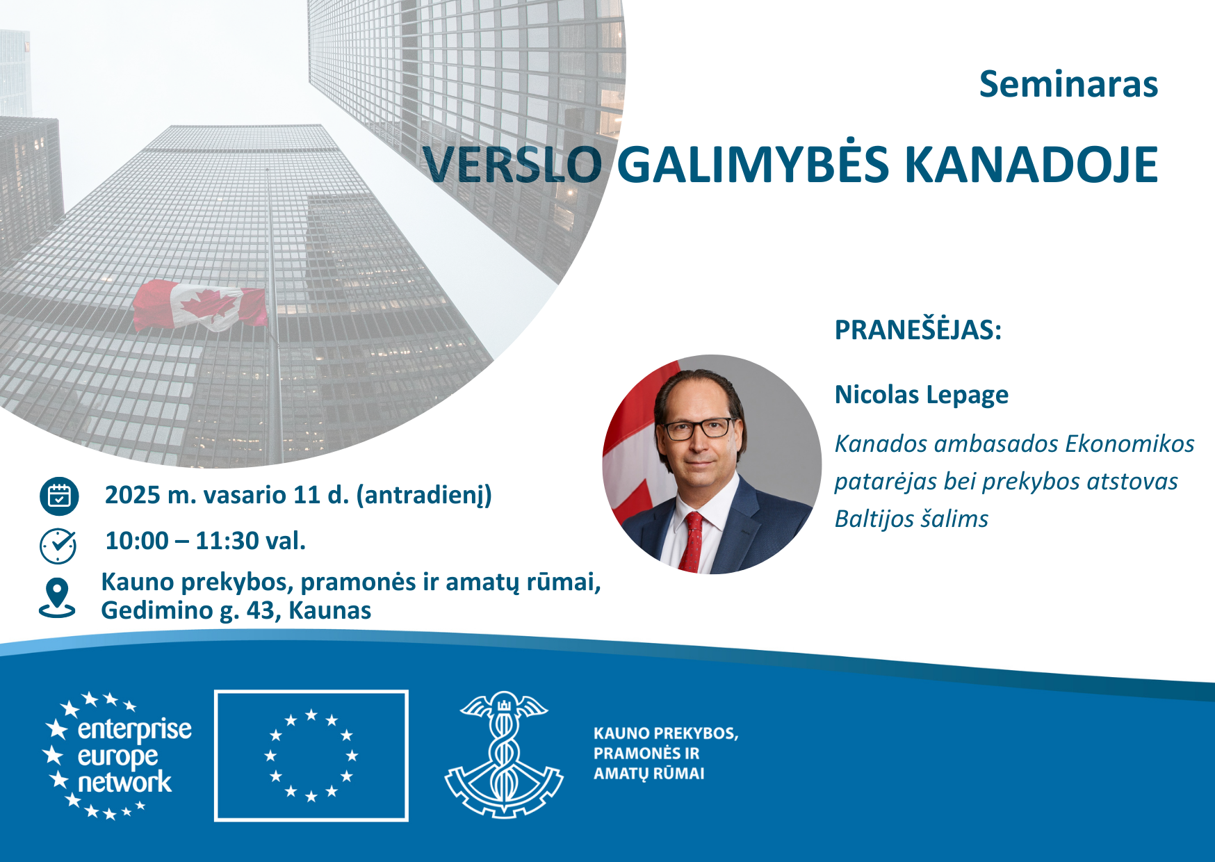 Kauno prekybos, pramonės ir amatų rūmai, Kanados ambasada Lietuvoje bei Enterprise Europe Network kviečia į nemokamą seminarą „Verslo galimybės Kanadoje“, kuris vyks 2025 m. vasario 11 d. (antradienį), 10:00 – 11:30 val. Kauno prekybos, pramonės ir amatų rūmuose, Gedimino g. 43, Kaunas.