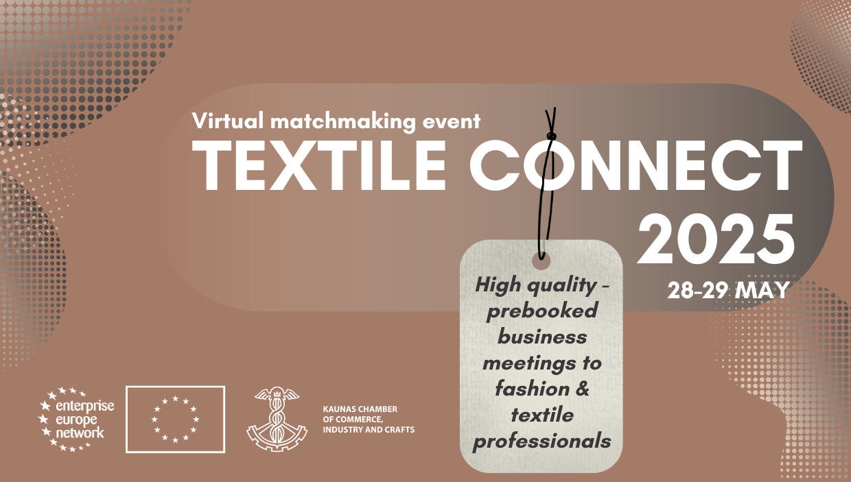 Kauno prekybos, pramonės ir amatų rūmai, kartu su Enterprise Europe Network, kviečia Jus dalyvauti tarptautiniame, virtualiame tekstilės sektoriaus verslo kontaktų renginyje „Textile Connect 2025“, kuris vyks 2025 m. gegužės 28-29 dienomis.